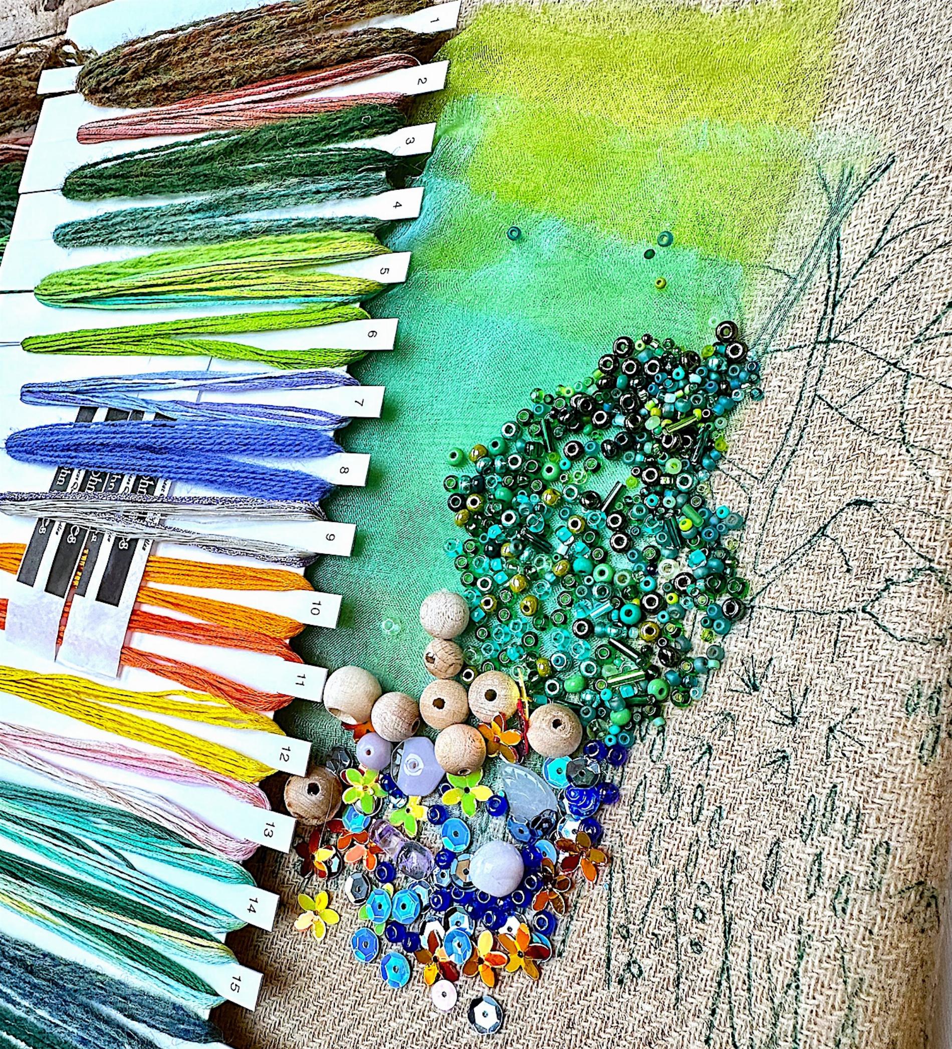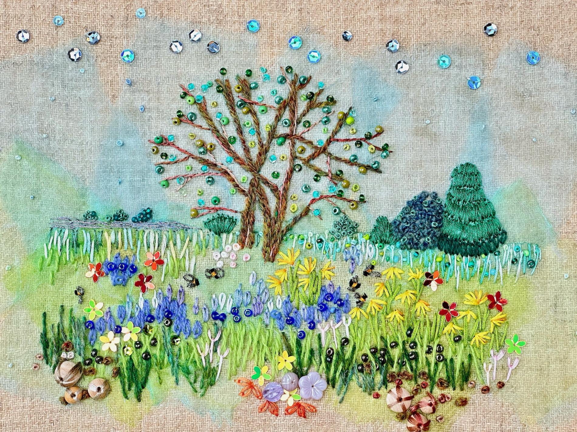 This lovely new kit focuses on the bright and uplifting colours of our countryside in the beginnings of Spring. Winter is over, the darkness and greys have been replaced with sunshine lots of bright colours! Bumble bees are collecting nectar as the flit through the new flowers. One large design printed on our tweed fabric brings this sunny scene to life. Lots and lots of texture! The fabric is large enough to be converted into a small cushion if you wish!