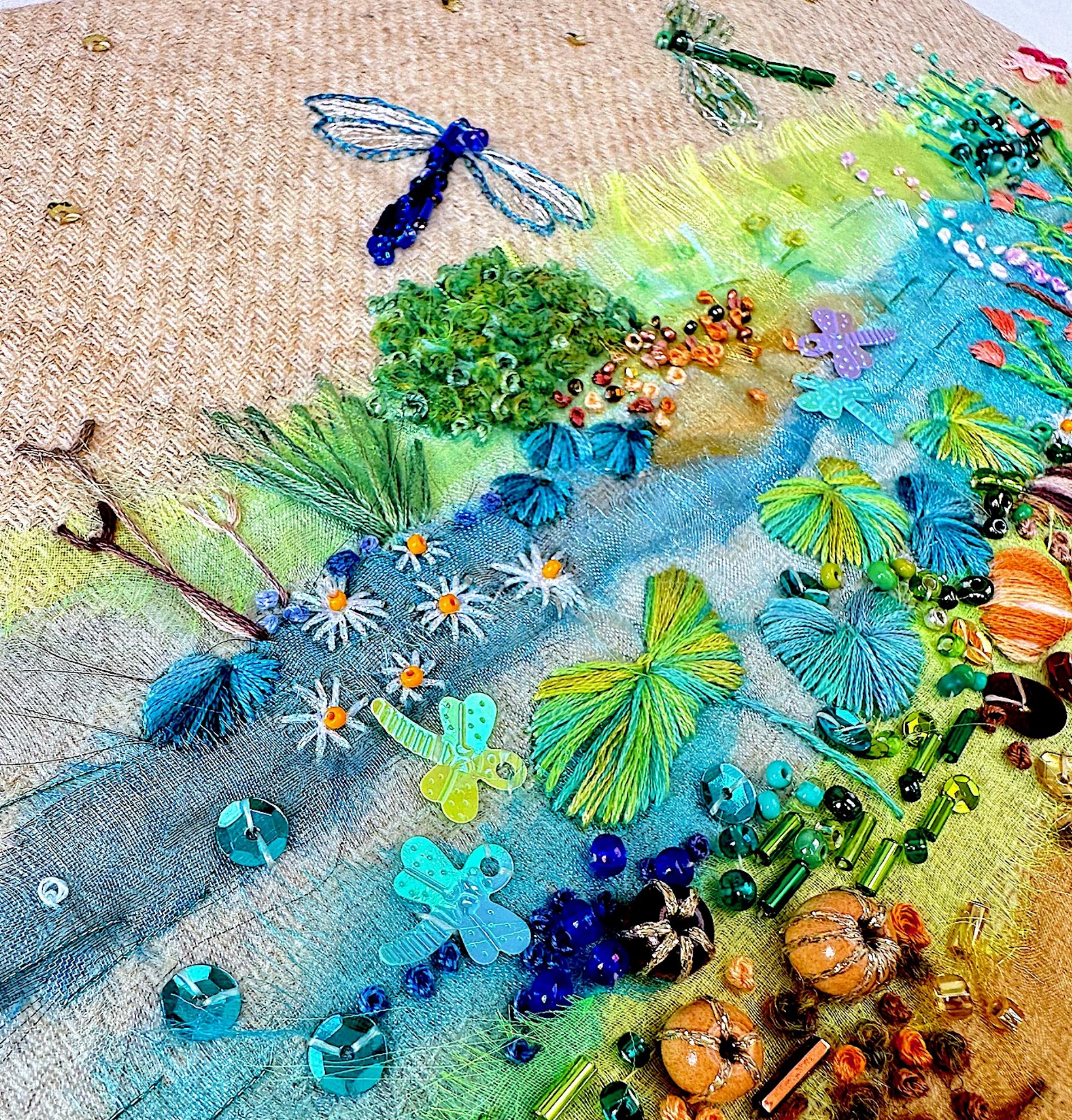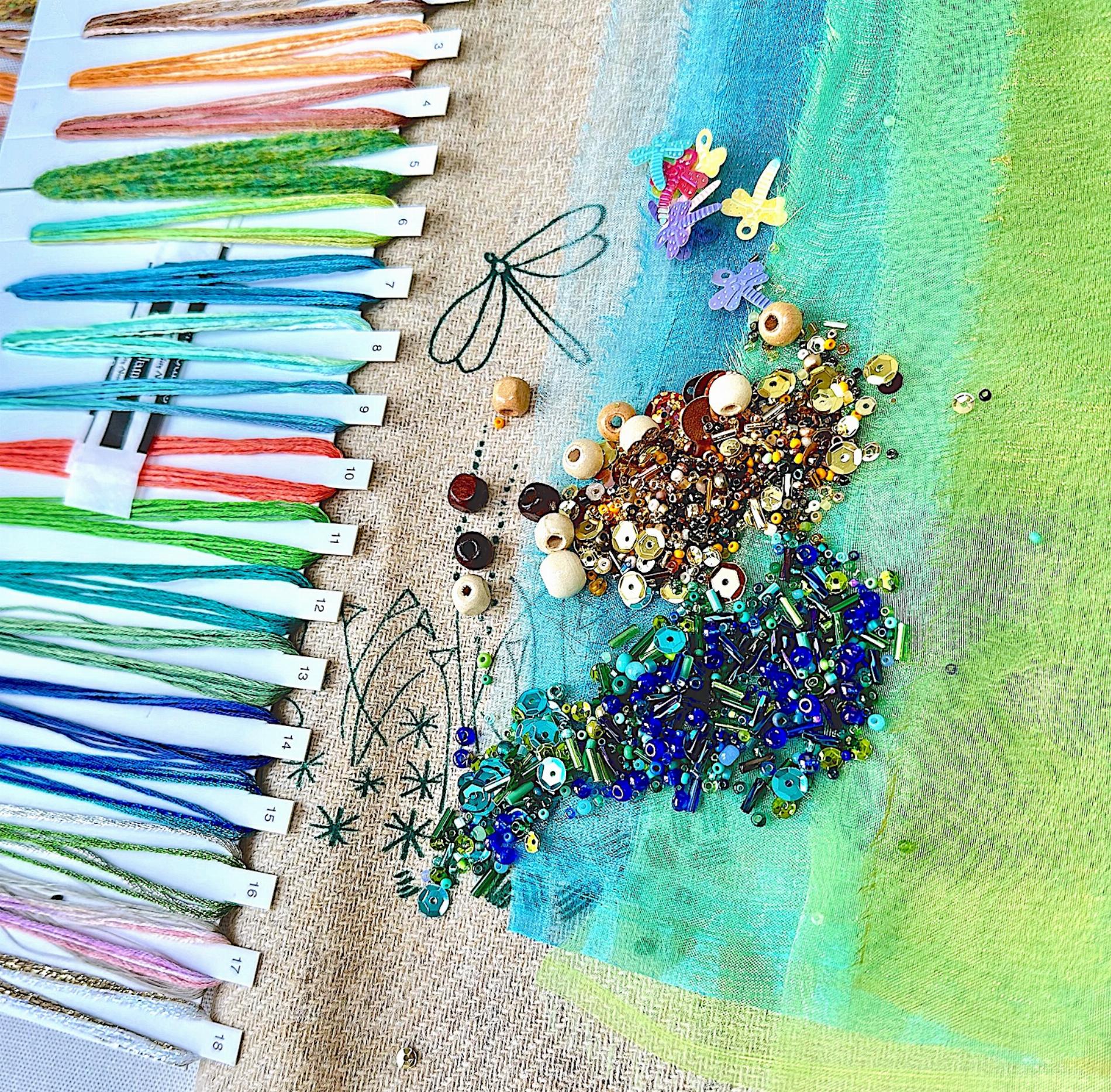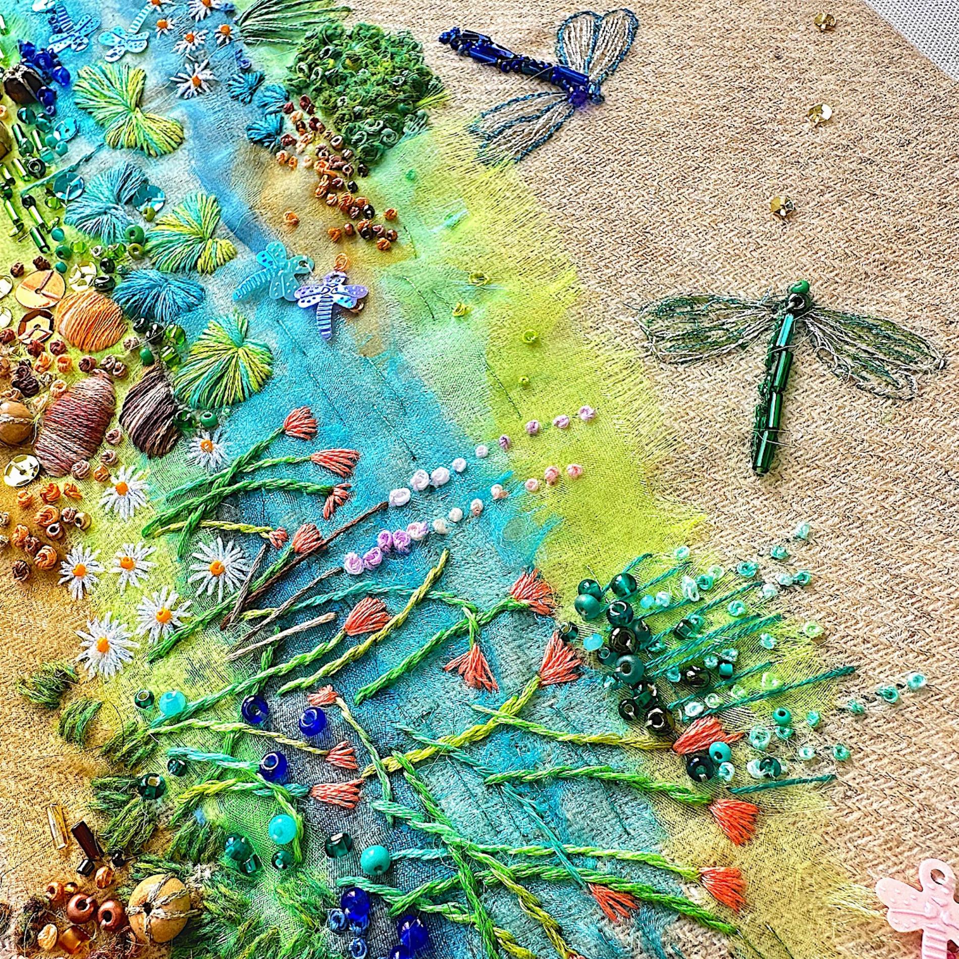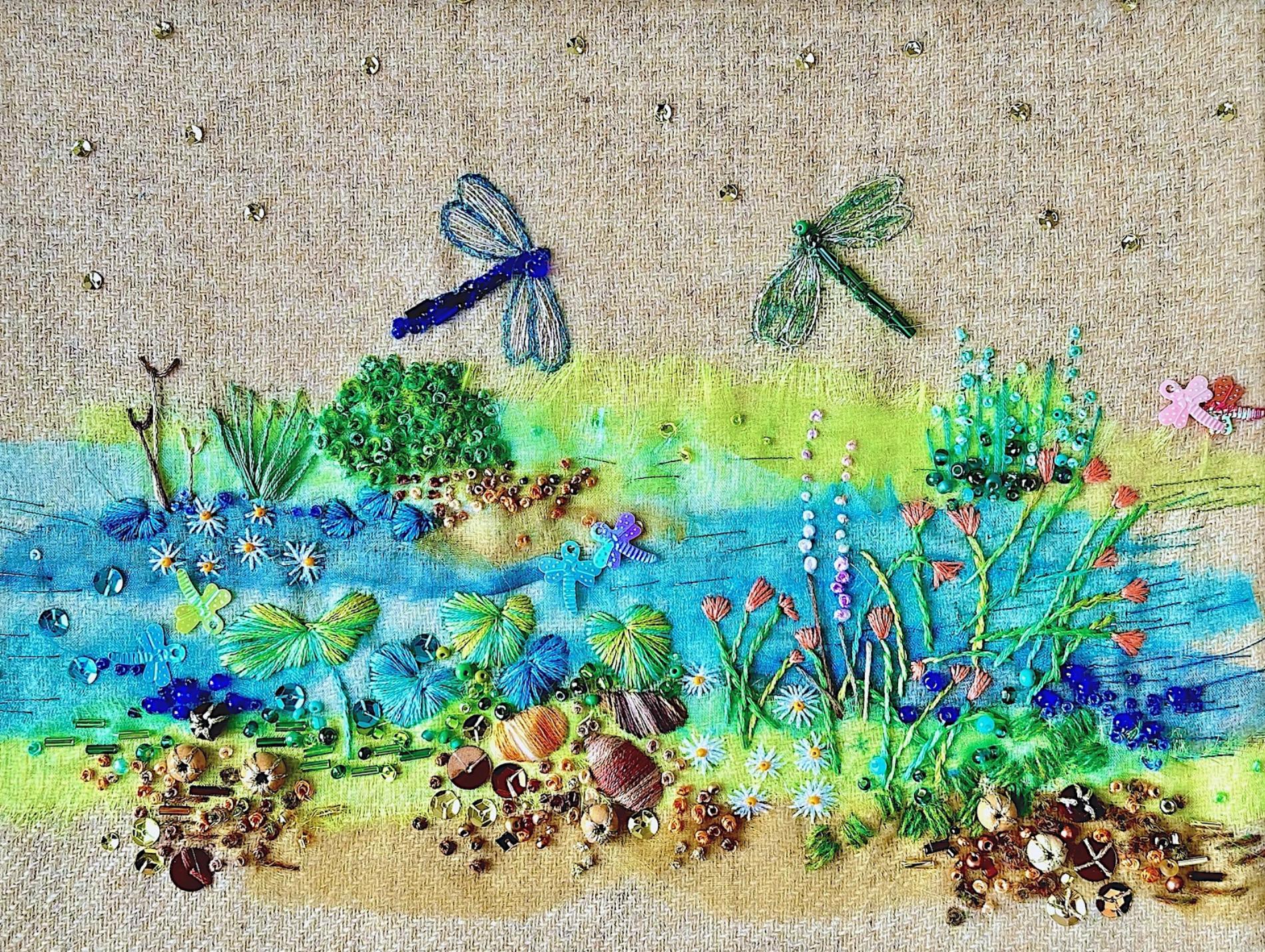This lovely new kit is all about on the bright colours and constant movement in any waterside scene whether it be a stream, riverside, or just your own garden pond. The reeds are rustling, the flowers are waving in the breeze, and the damselflies are dancing above the water. The fabric is large enough to be converted into a small cushion if you wish!