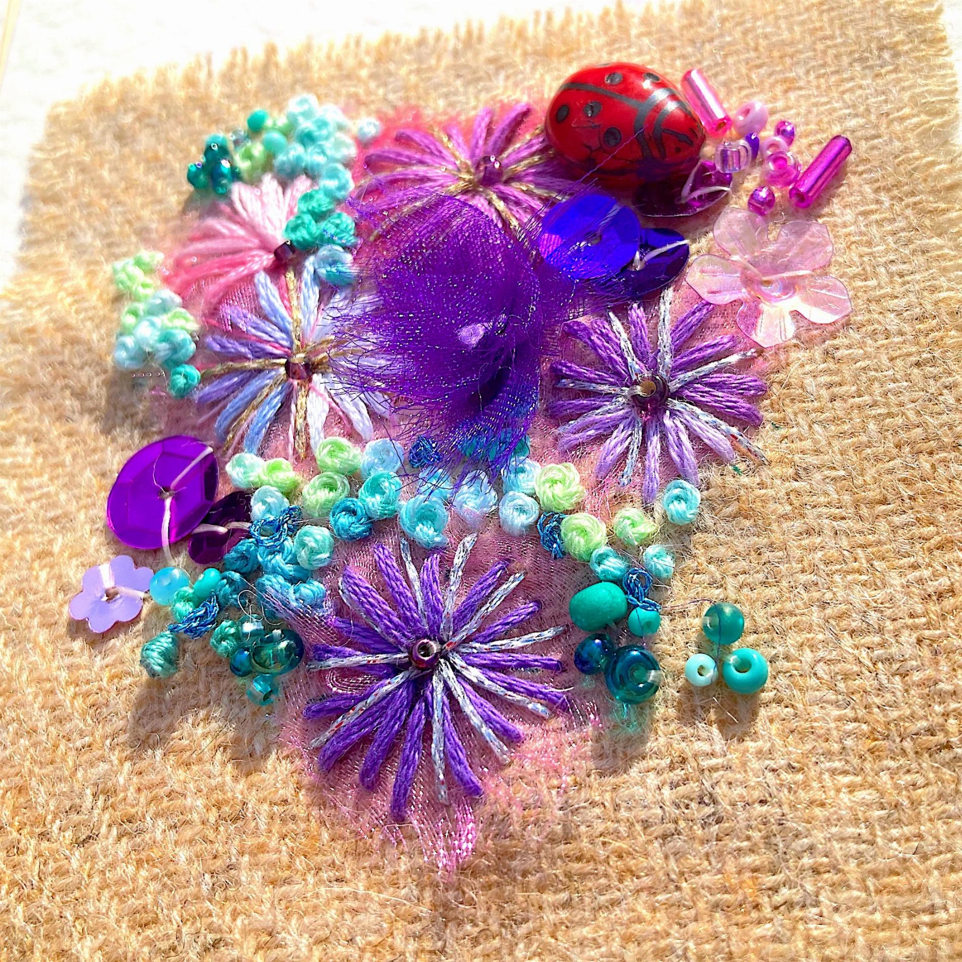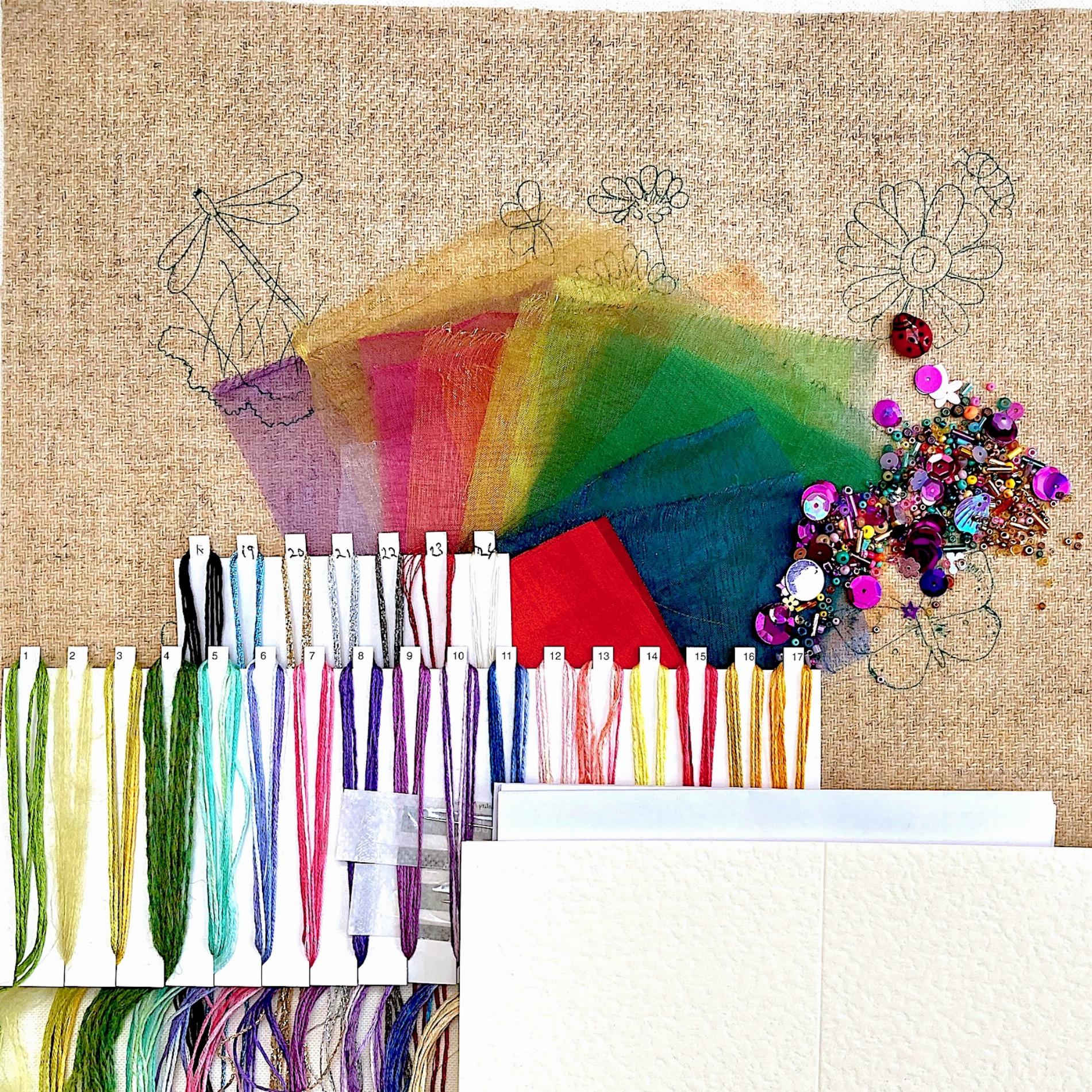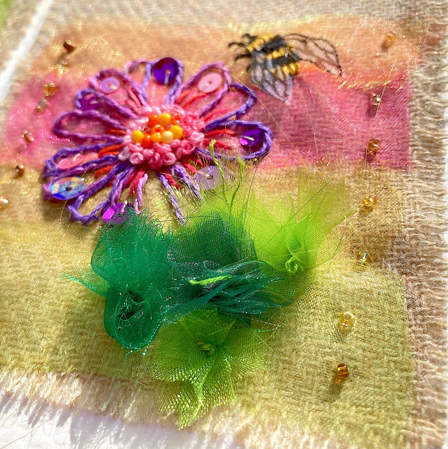 Spring brings the sounds and sights of a myriad of winged insects to our gardens: the fabulous pollinators! Bees, butterflies, and a damselfly have alighted on these cards. The joy of Spring flowers and the wonderful flying insects are recreated for you to stitch and turn into cards. Coloured organza for the backgrounds makes these cards a real treat. Plenty of beads and sequins for lots of added colour and sparkle!