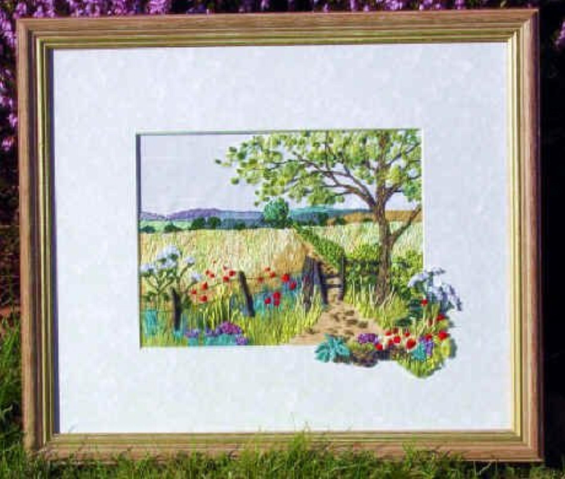 Contents: Hand cut cream coloured mount, printed and handpainted background fabric, printed organza for motif, threads on a numbered organiser card, plastic wrapped chenille needle, fully illustrated step by step instructions, and MDF backing board.