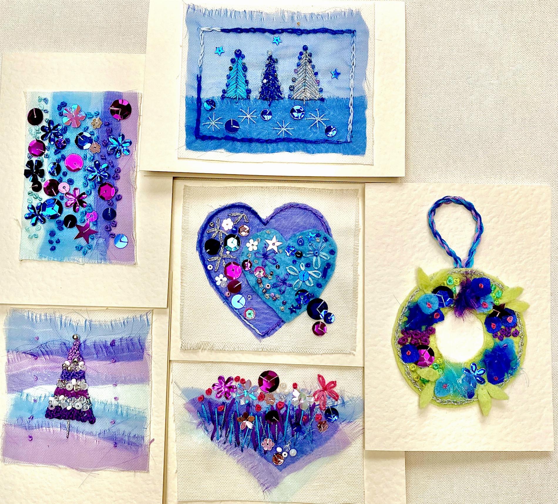 These lovely little card kits come with six different designs. Coloured organza for the background and a bit of silk for the flowers make these kits a festive treat. Lots of metallic threads and fabrics and sparkly beads mean you can add as much bling as you wish!
