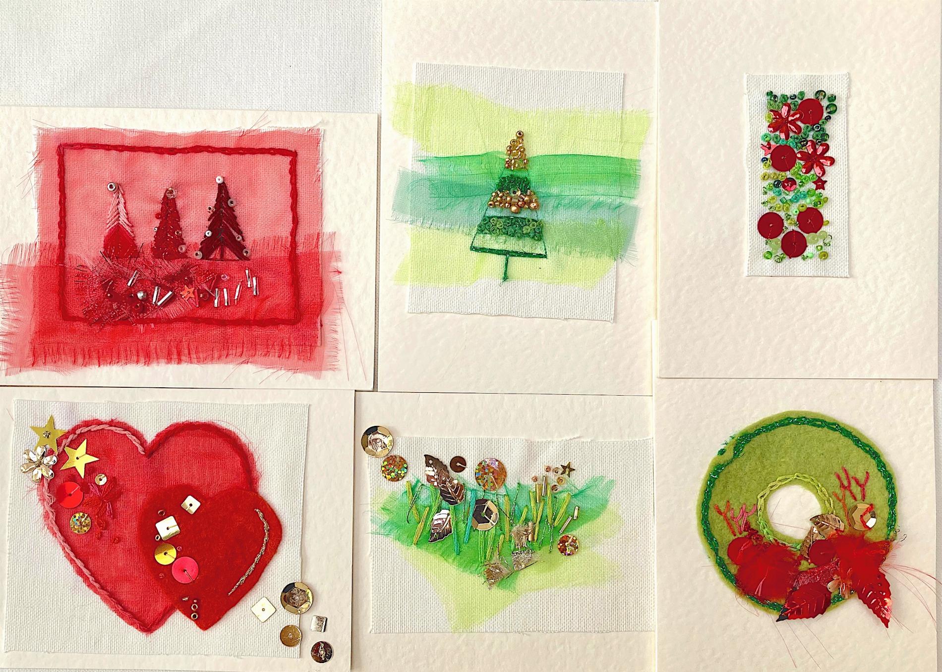 These lovely little card kits come with six different designs. Coloured organza for the background and a bit of silk for the flowers make these kits a festive treat. Lots of metallic threads and fabrics and sparkly beads mean you can add as much bling as you wish!