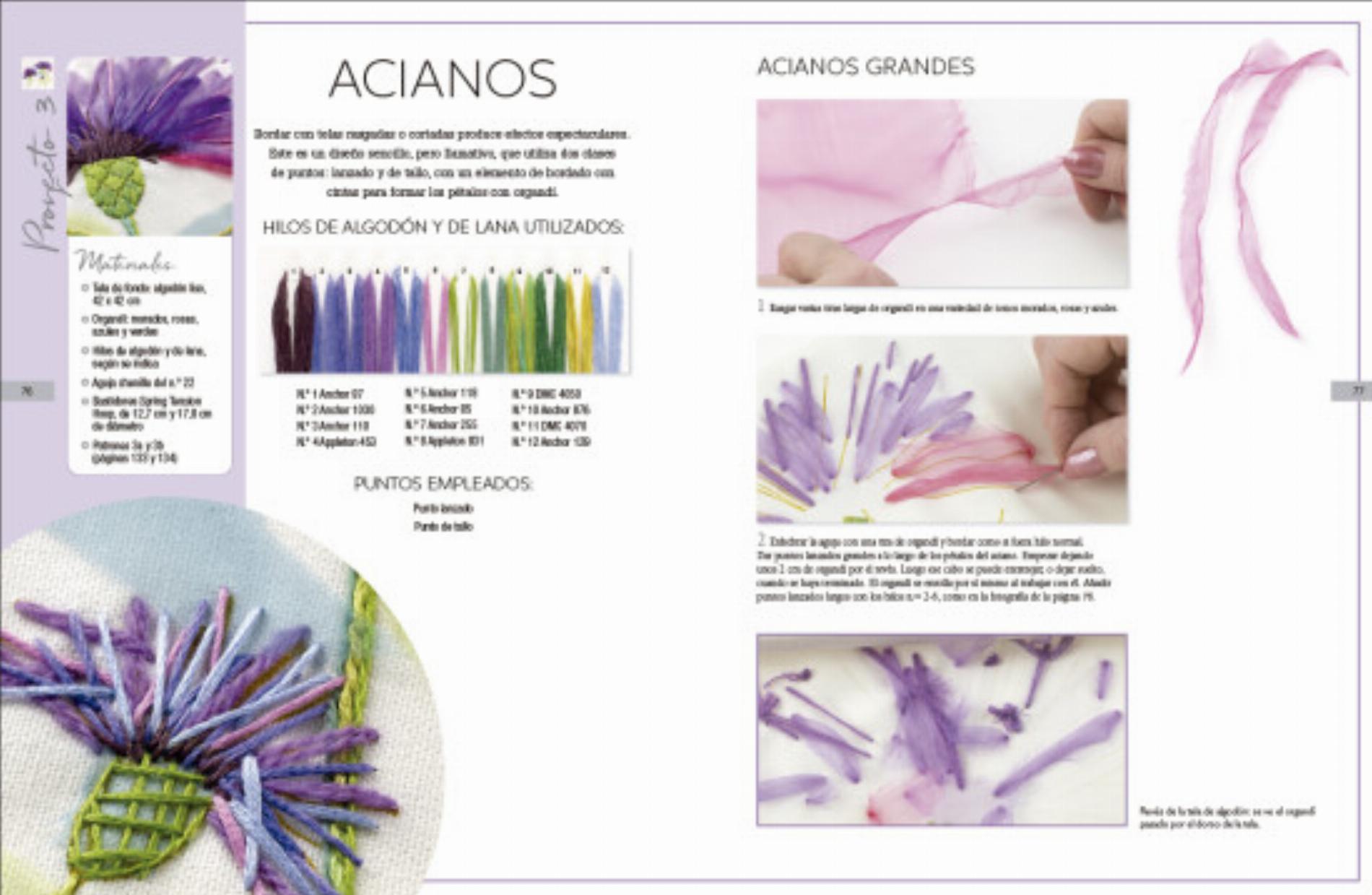Incluye toda la información necesaria sobre los materiales, los distintos tipos de puntos y las técnicas, que sorprenderán por la innovación en la combinación de materiales como el organdí y las cuentas o por la posibilidad de fundir motivos. Es una gran fuente de inspiración para aprender y disfrutar bordando motivos de la naturaleza de gran belleza, con efecto tridimensional. Todo ello hará disfrutar del arte del bordado a mano.