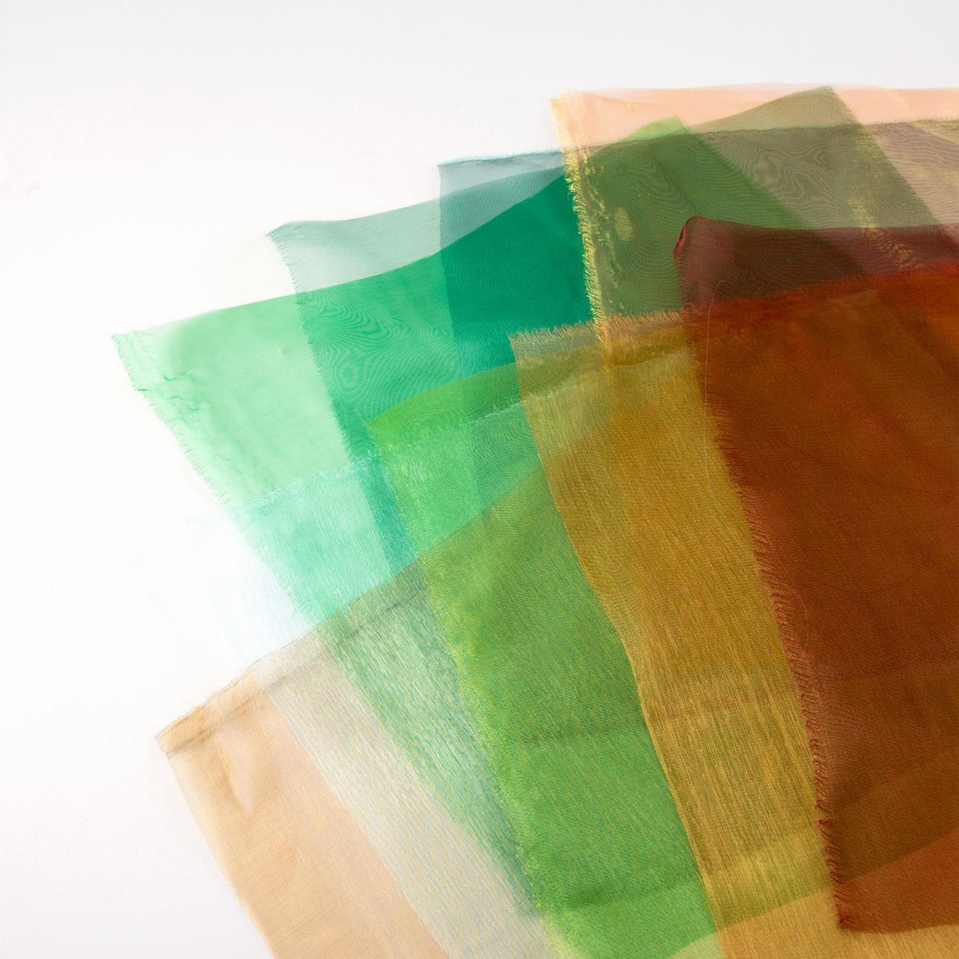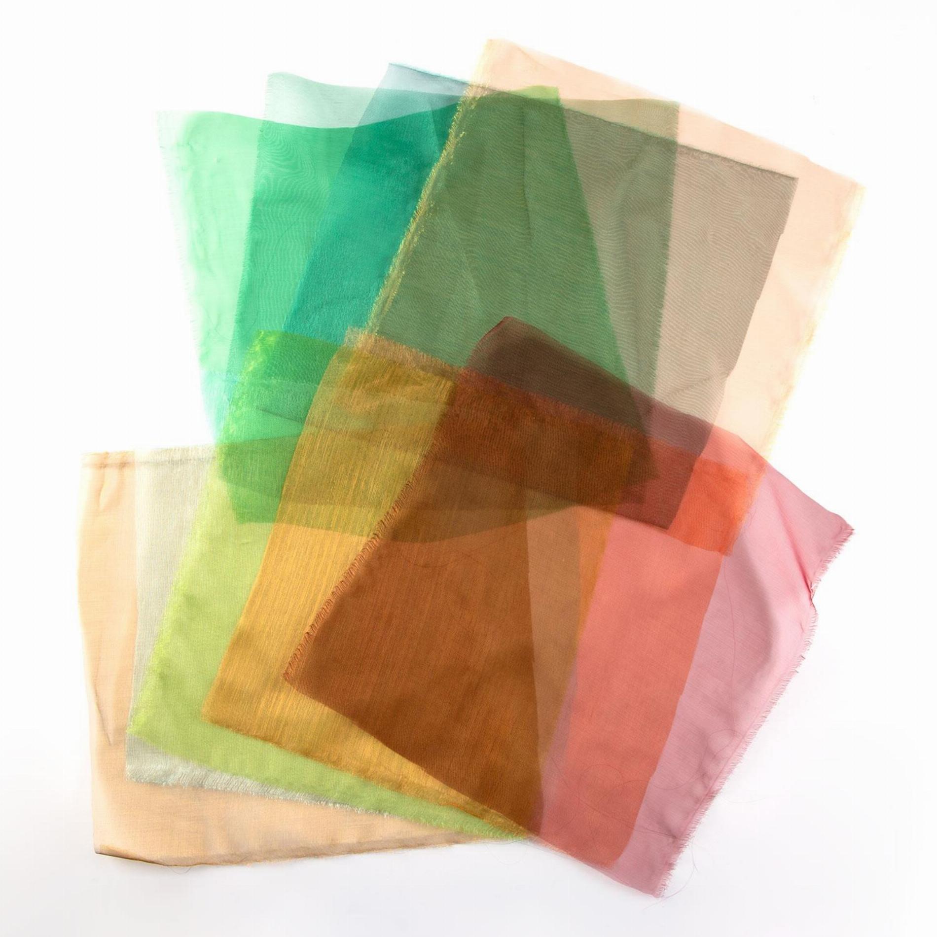 10 separate pieces of different colours of our organza fabric specially chosen for the backgrounds of your embroidery projects including blue for sky or water effects.