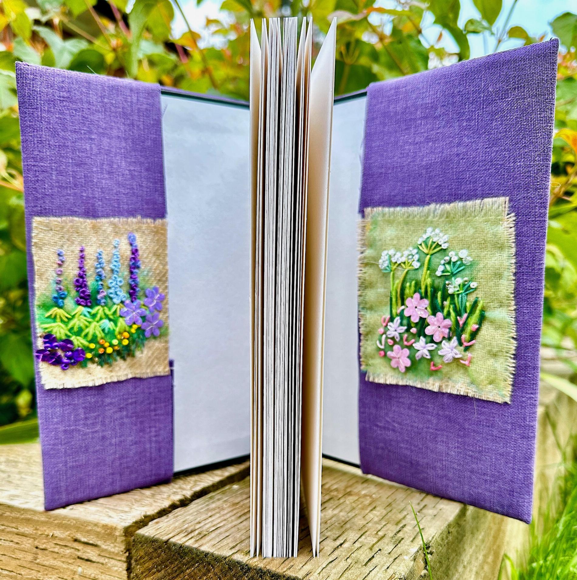 This lovely book cover kit comes with plum coloured cotton fabric for the cover and a large piece of 100% wool tweed fabric for the designs. Will fit A5 and smaller books and notebooks.