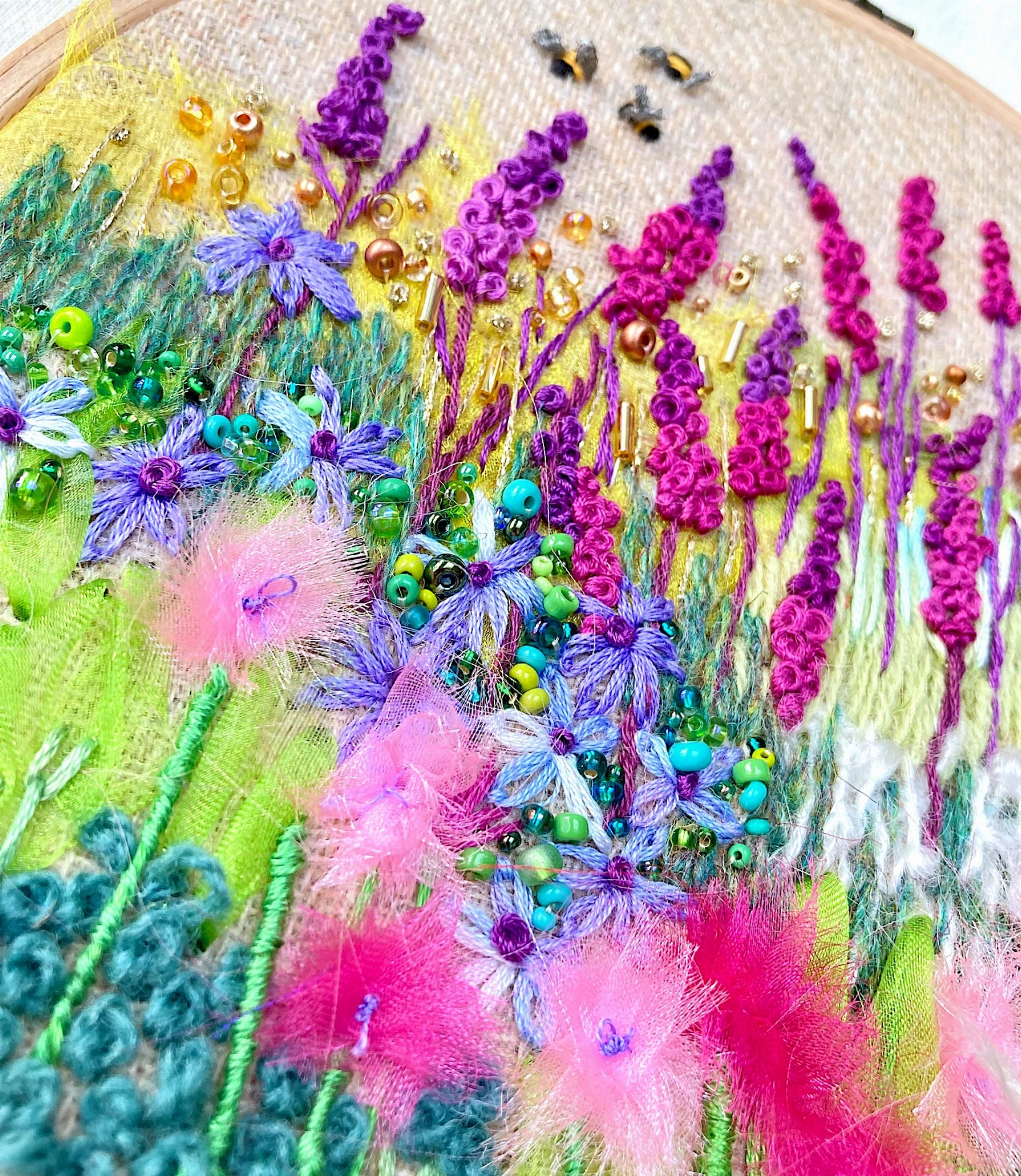 This gorgeous embroidery is stitched on Rowandean’s own unique tweed fabric. Fluffy organza carnations spill across the foreground while the flower spikes of Loosestrife “Beaujolais” punctuate the horizon line. It looks amazing when mounted in one of our 7” or 8” hardwood display hoops.