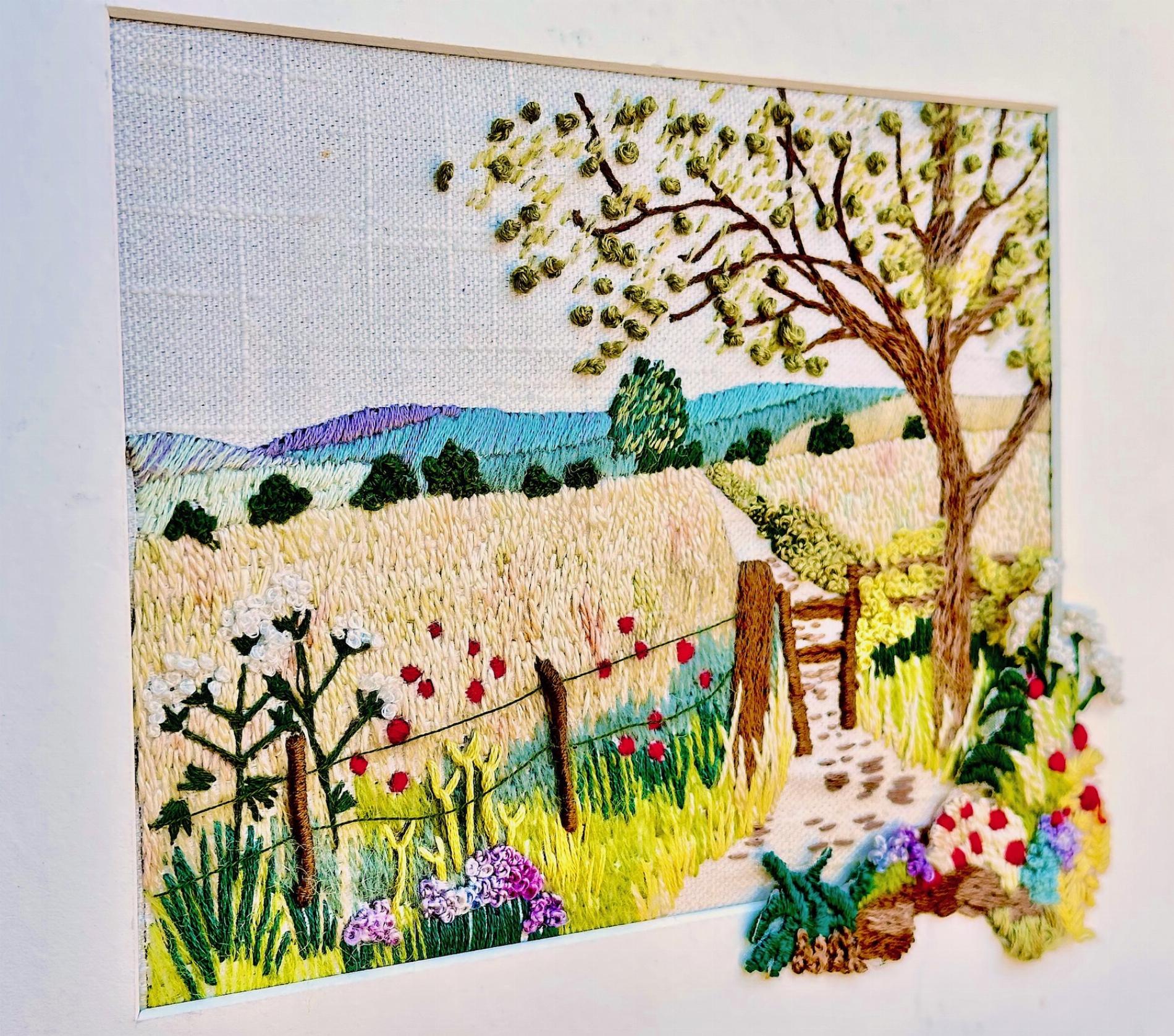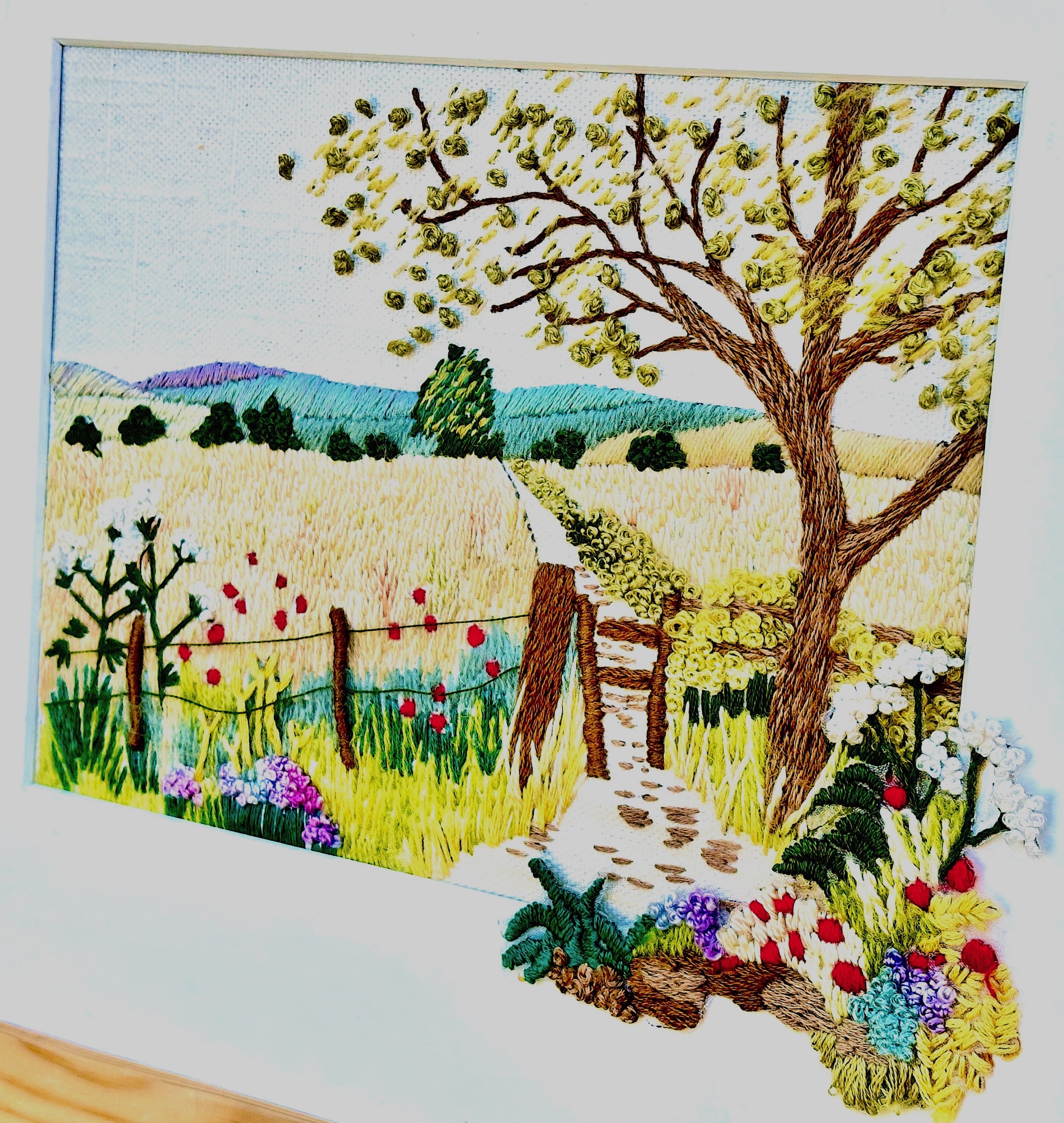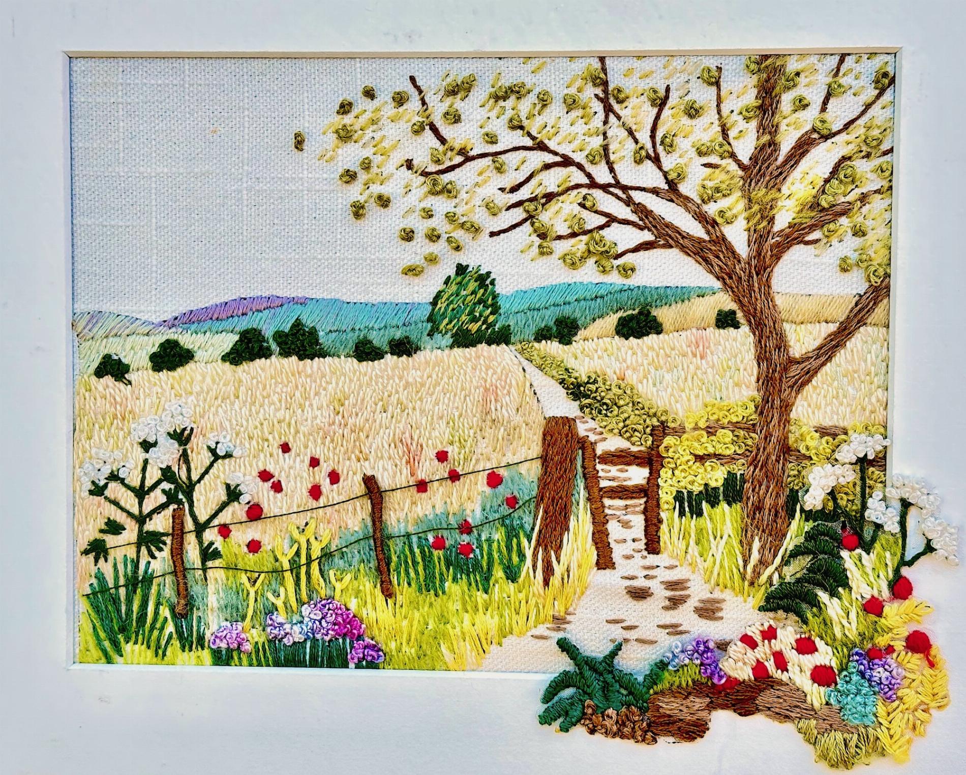 Contents: Hand cut cream coloured mount, printed and handpainted background fabric, printed organza for motif, threads on a numbered organiser card, plastic wrapped chenille needle, fully illustrated step by step instructions, and MDF backing board.