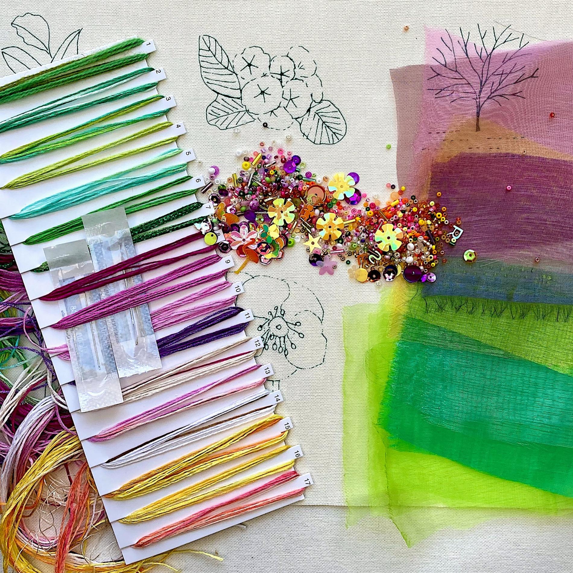 Spring colours are bright and vibrant with white, pink, and yellow dominating the landscape. Lime green new shoots light up the countryside! These colours and feelings of a new beginning are recreated for you to stitch and turn into cards. Coloured organza for the backgrounds makes these cards a real treat. Plenty of beads and sequins for lots of added colour and sparkle!