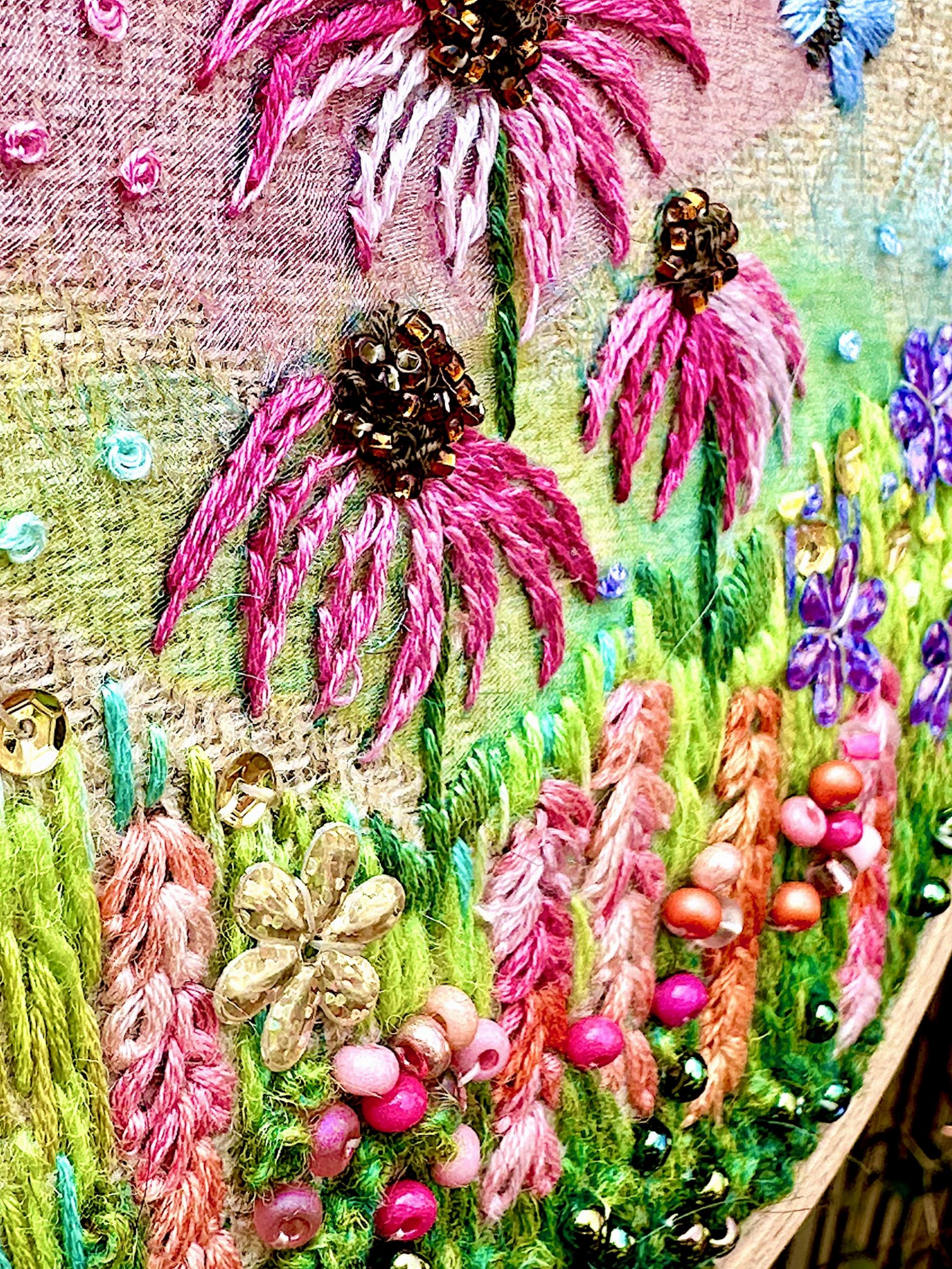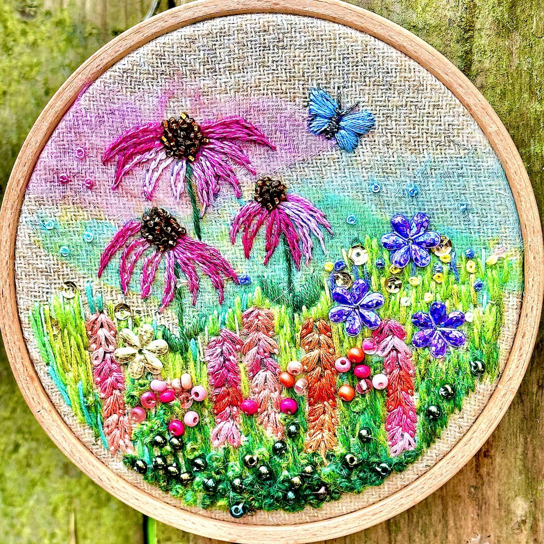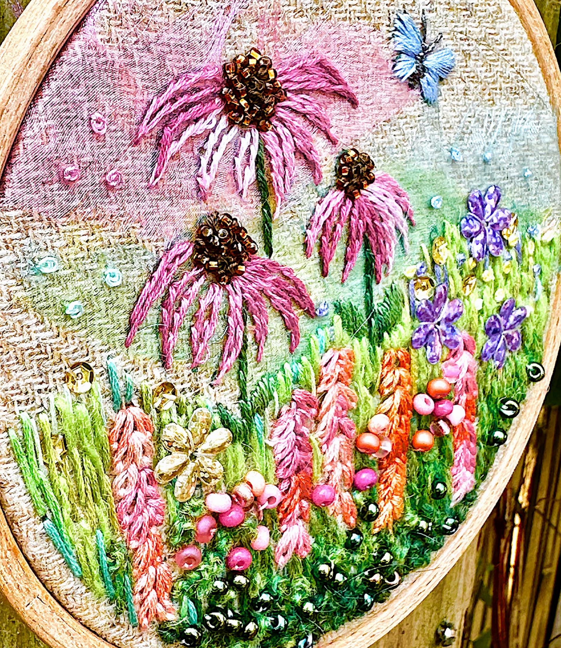 Snapdragons are an easy to grow biennial that come in a myriad of colours while echinacea with their swept back petals rise above the rest of the flower border. A common blue butterfly flitting past completes the scene. Simple stitching and lots of beads and sequins and of course, organza, make for an easy and pleasant kit to do. As with most Rowandean kits there is plenty of scope to do your own thing!