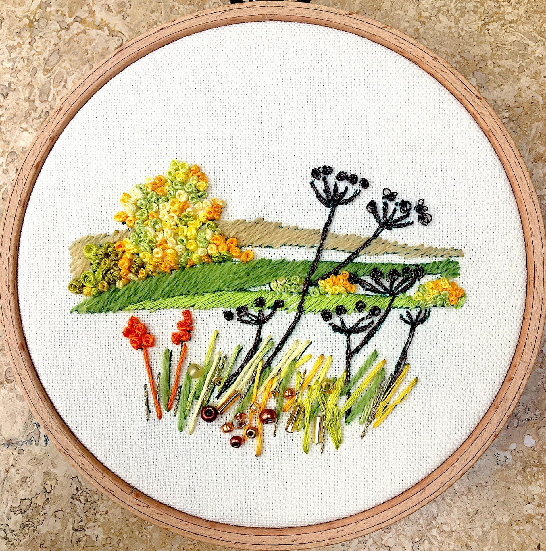 This lovely hand embroidery kit was inspired by the wonderful changing light at different times of day. The kit has a printed background of 100% pure cotton fabric with the majority of the stitching done in simple straight stitches using stranded cotton and wool threads with beads to give a little bling. Mount in our 5” hardwood display hoops for a truly expert looking finish.