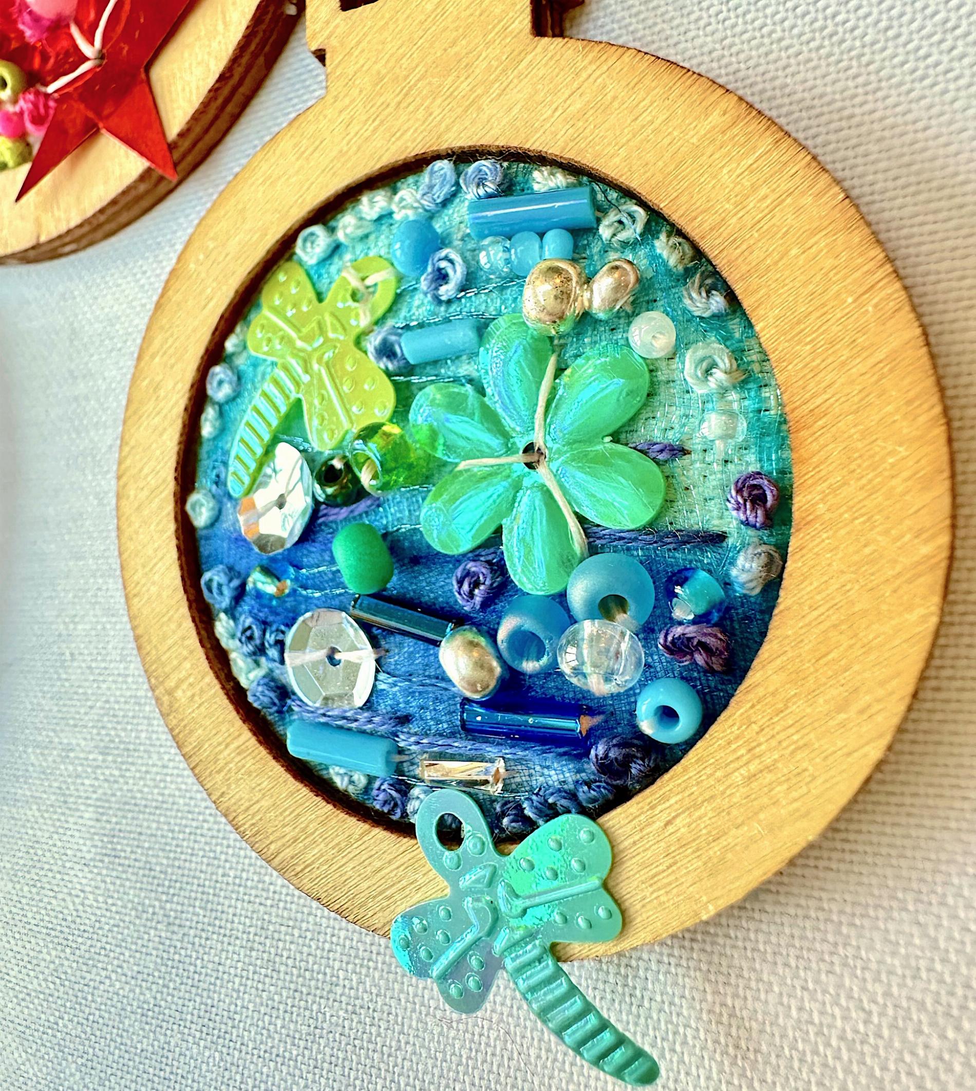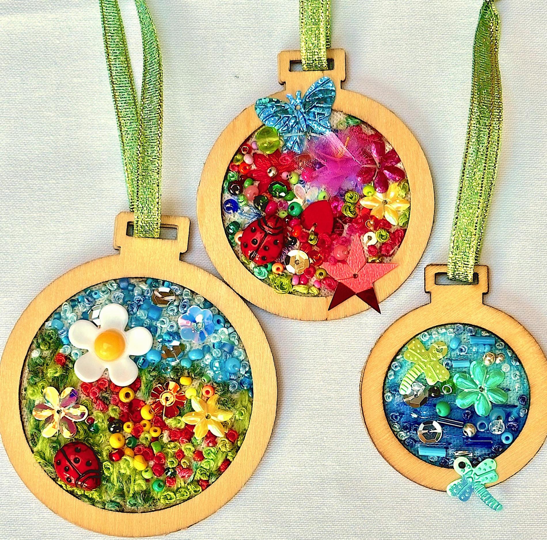 It’s Holiday time again! What says holidays more than a lovely little project that is perfect for starting off your children or grandchildren into the wonderful world of embroidery! Lots of fun beads and sequins packed into each design make for an easy but bling filled bauble. You can paint or decorate the MDF cut outs or leave them as is for that rustic feel. Tie the baubles together with the provided ribbon or hang individually. Simple stitching and lots of beads and sequins make for an easy and pleasant kit to do. As with most Rowandean kits there is plenty of scope to do your own thing!