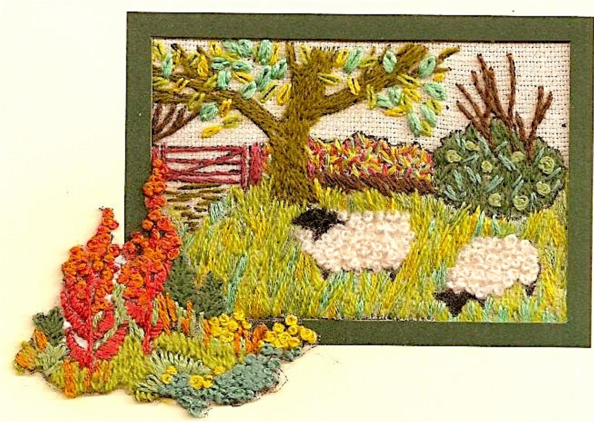 A typical Dershire country scene complete with sheep! Inside every mini & mini plus kit you will find fabric with design clearly printed, threads on an organizer card, clear "customer proof" instructions and diagrams, a chenille needle (bigger eye than an ordinary needle) wrapped in protective plastic, and on the front cover, Rowandean's "see every stitch" colour photo.
