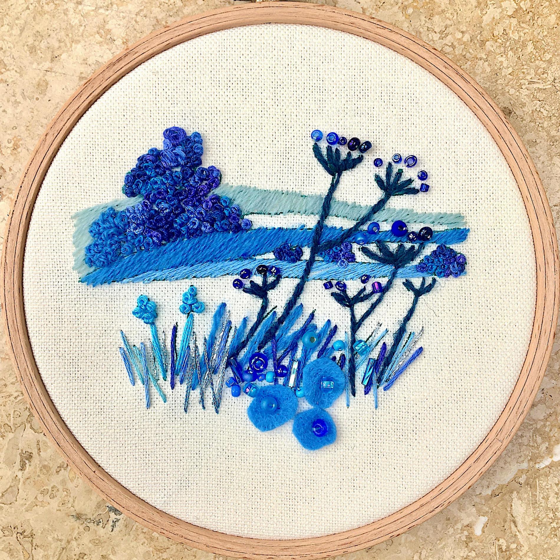 This lovely hand embroidery kit was inspired by the wonderful changing light at different times of day. The kit has a printed background of 100% pure cotton fabric with the majority of the stitching done in simple straight stitches using stranded cotton and wool threads with beads to give a little bling. Mount in our 5” hardwood display hoops for a truly expert looking finish.