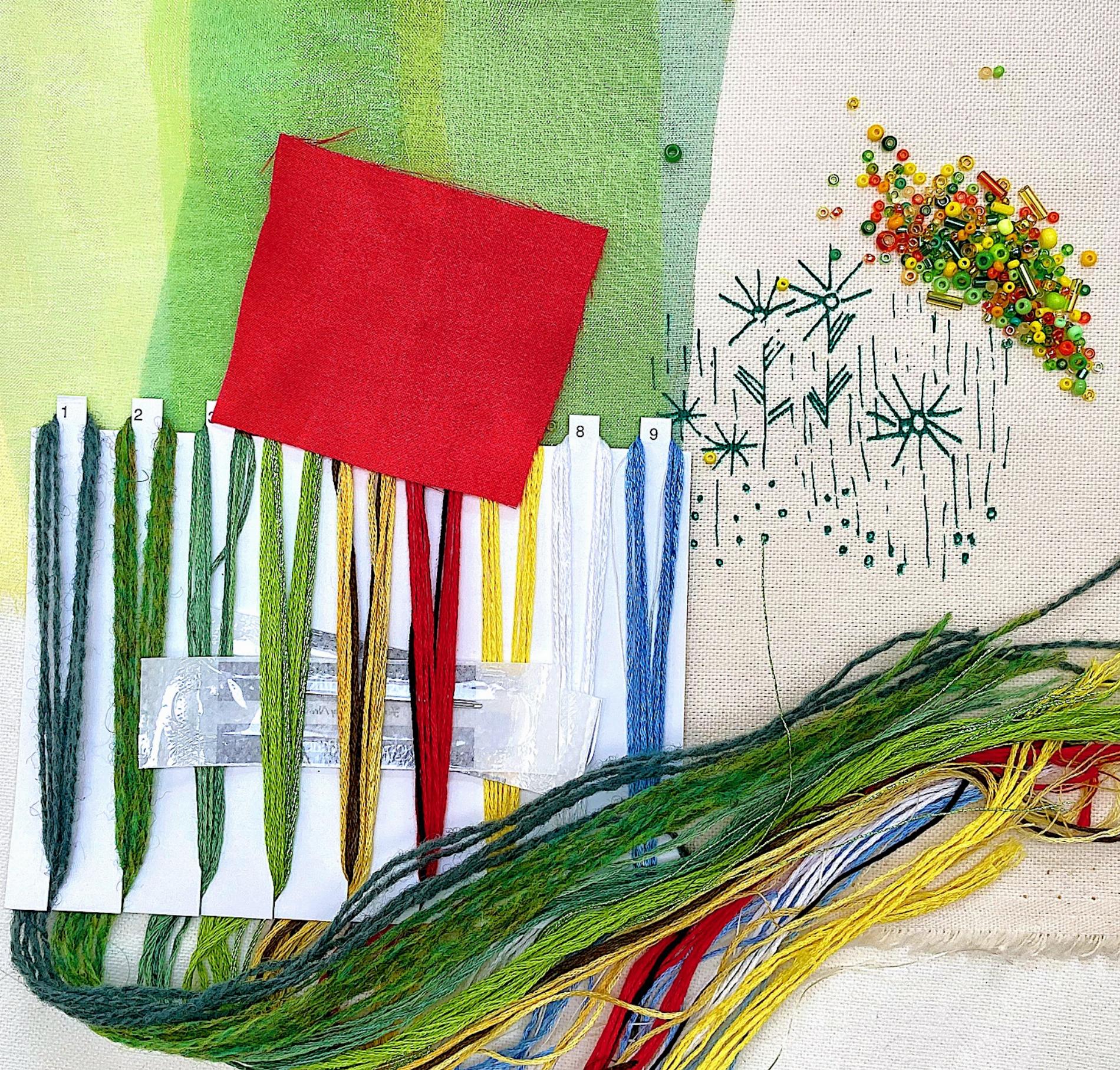 Inside every mini & mini plus kit you will find fabric with design clearly printed, threads on an organizer card, clear "customer proof" instructions and diagrams, a chenille needle (bigger eye than an ordinary needle) wrapped in protective plastic, and on the front cover, Rowandean's "see every stitch" colour photo.