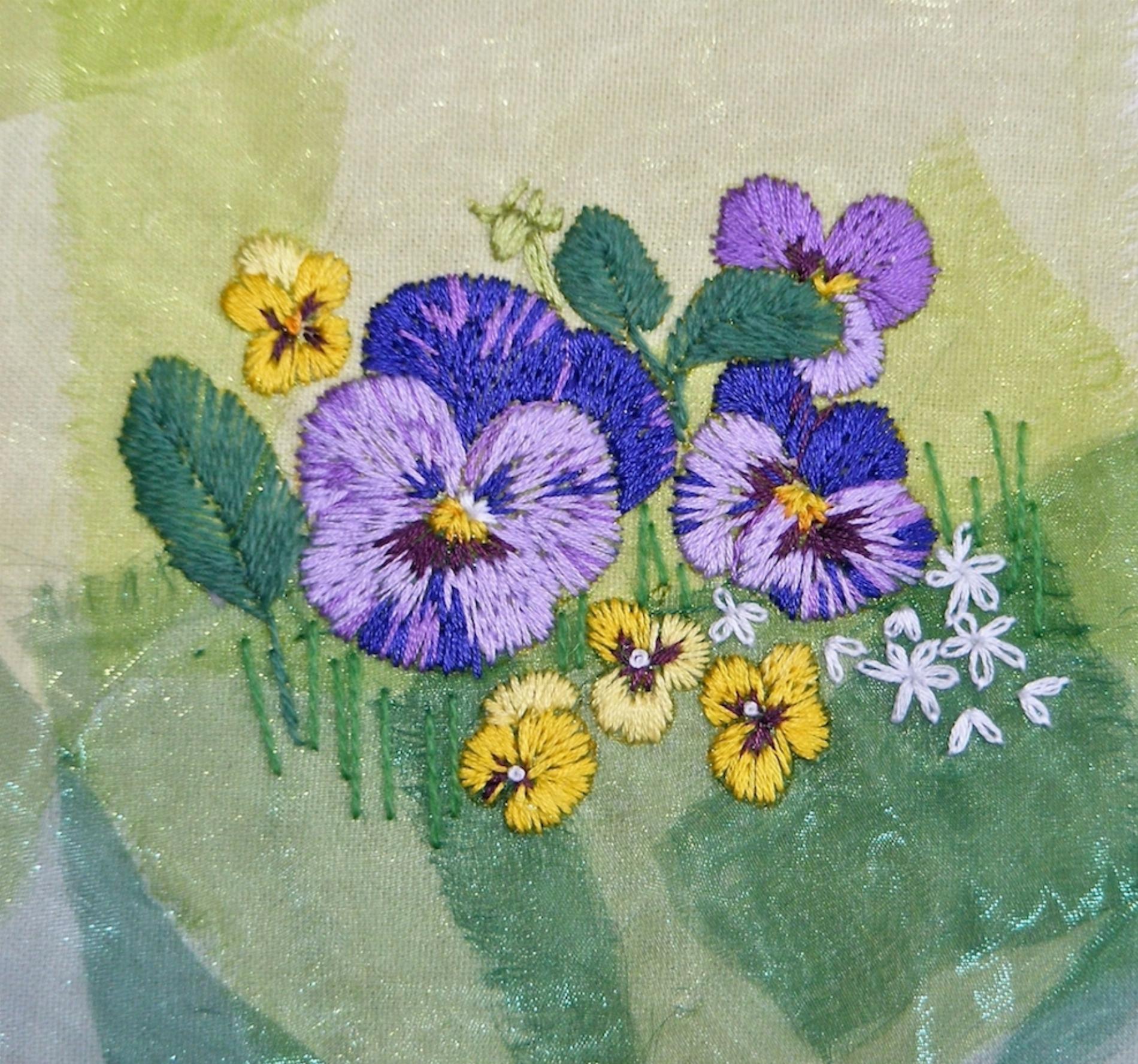 This lovely hand embroidery kit was inspired by the riot of colour forming a veritable festival of flowers in any summer time garden. Each kit has a background of coloured organza with the petals, leaves, and stems done in simple straight stitches using stranded cotton and wool threads. The design is clearly printed on pure cotton fabric.