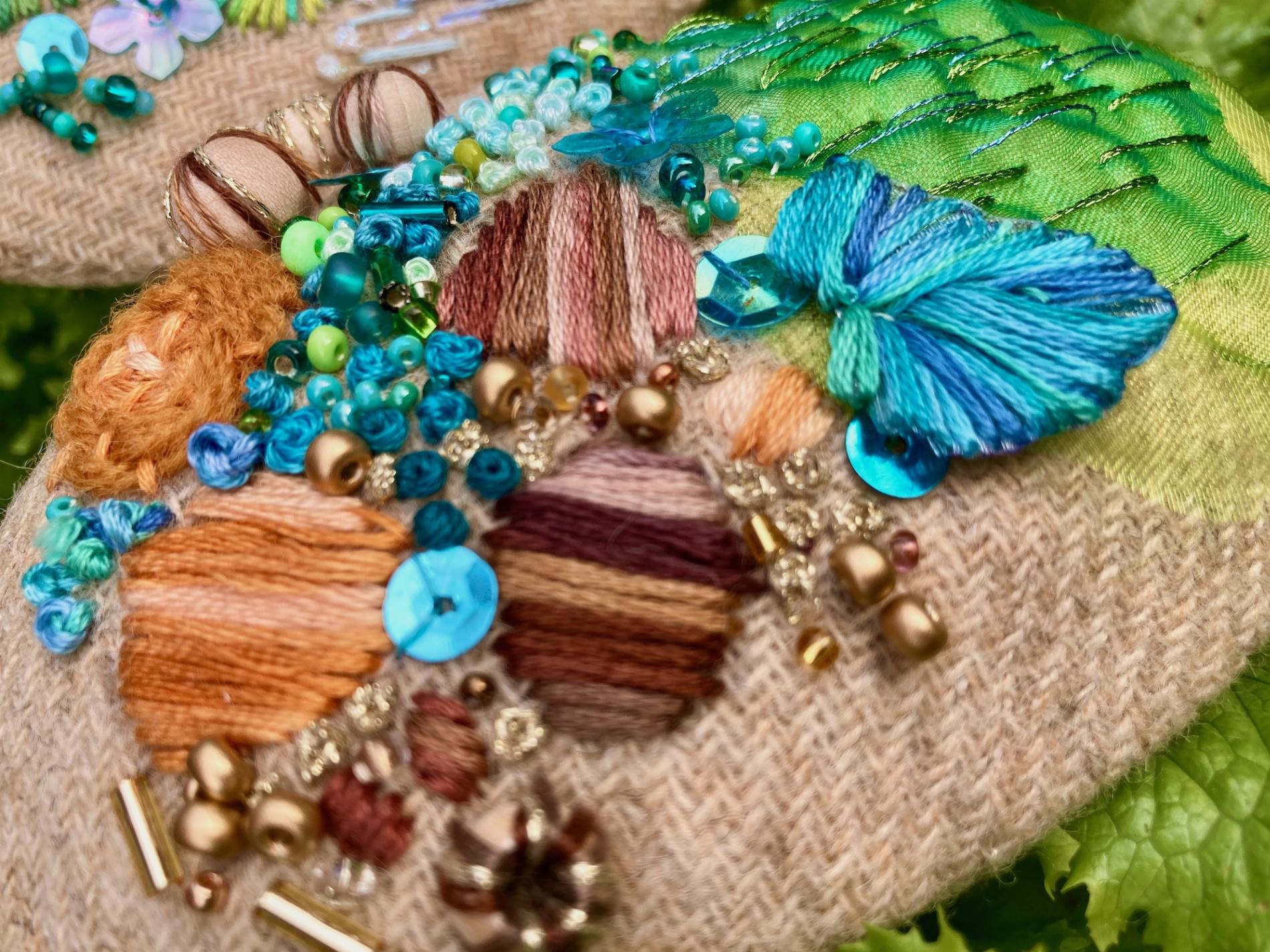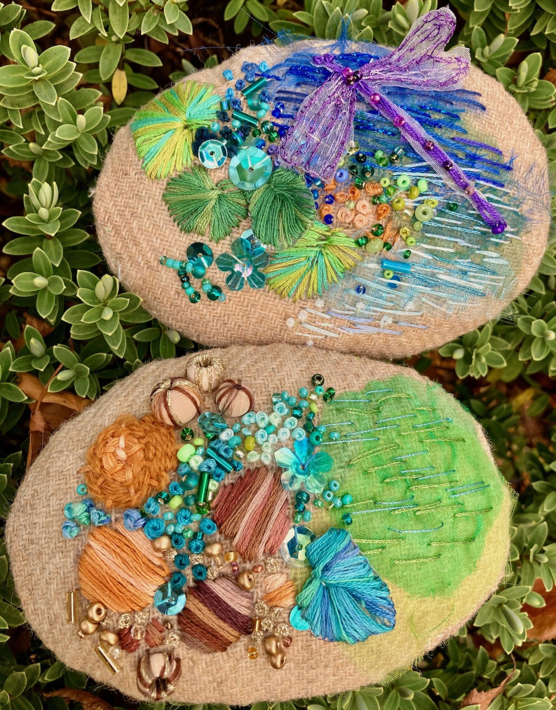 These gorgeous embroideries are stitched on Rowandean’s own unique tweed fabric. This kit makes two “pebbles” that look