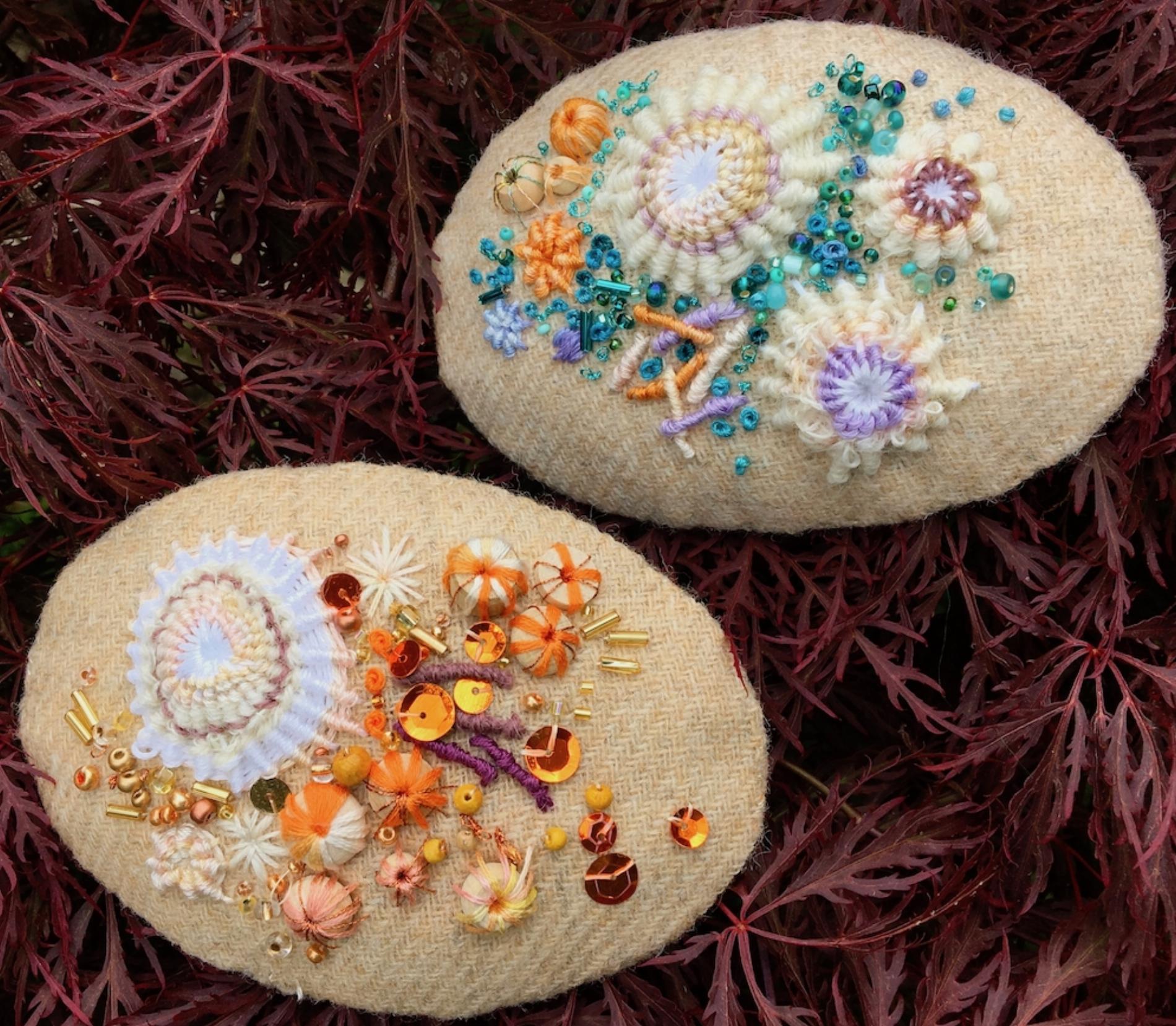 These gorgeous embroideries are stitched on Rowandean’s own unique tweed fabric. This kit makes two “pebbles” covered with embroidered shells, rocks, driftwood and everything you’d expect to find on a beautiful British beach. Blue beads and sequins gives a water effect to the background of the pebble we call Rockpool Reflections” while beads and sequins give lots of texture and sparkle to the pebble called “Jewels in the Sand”.