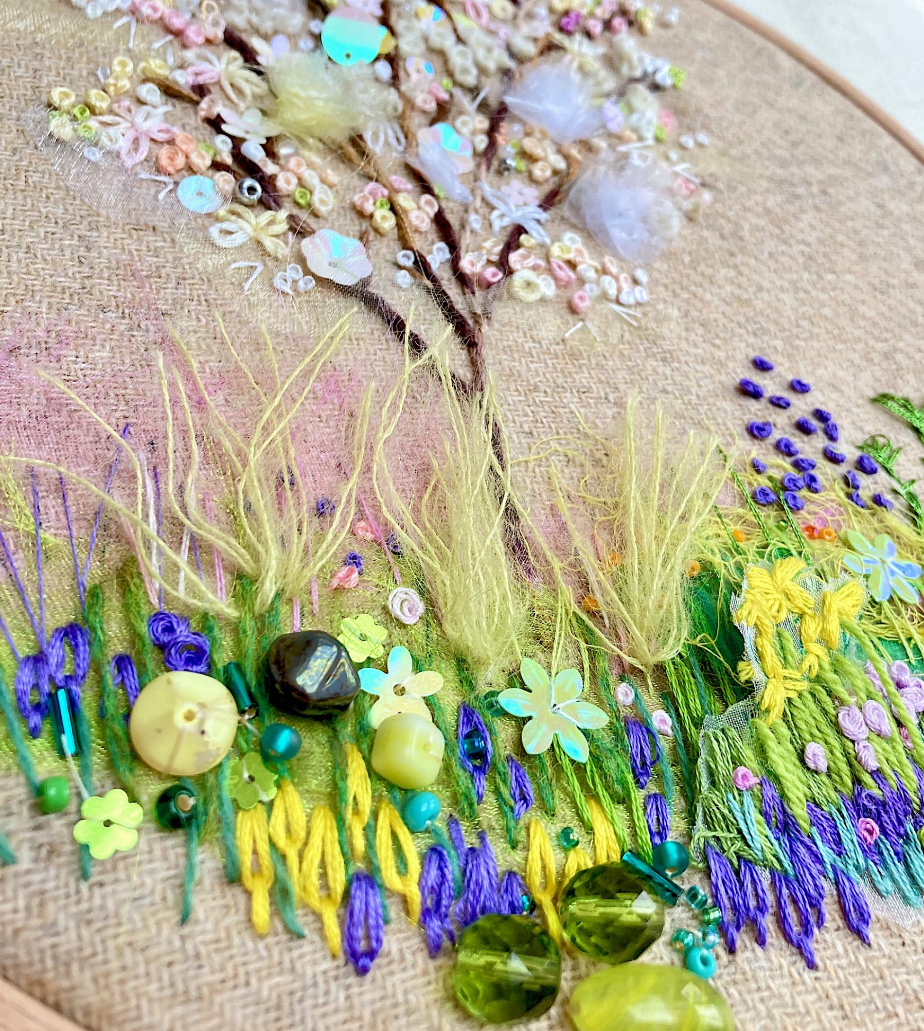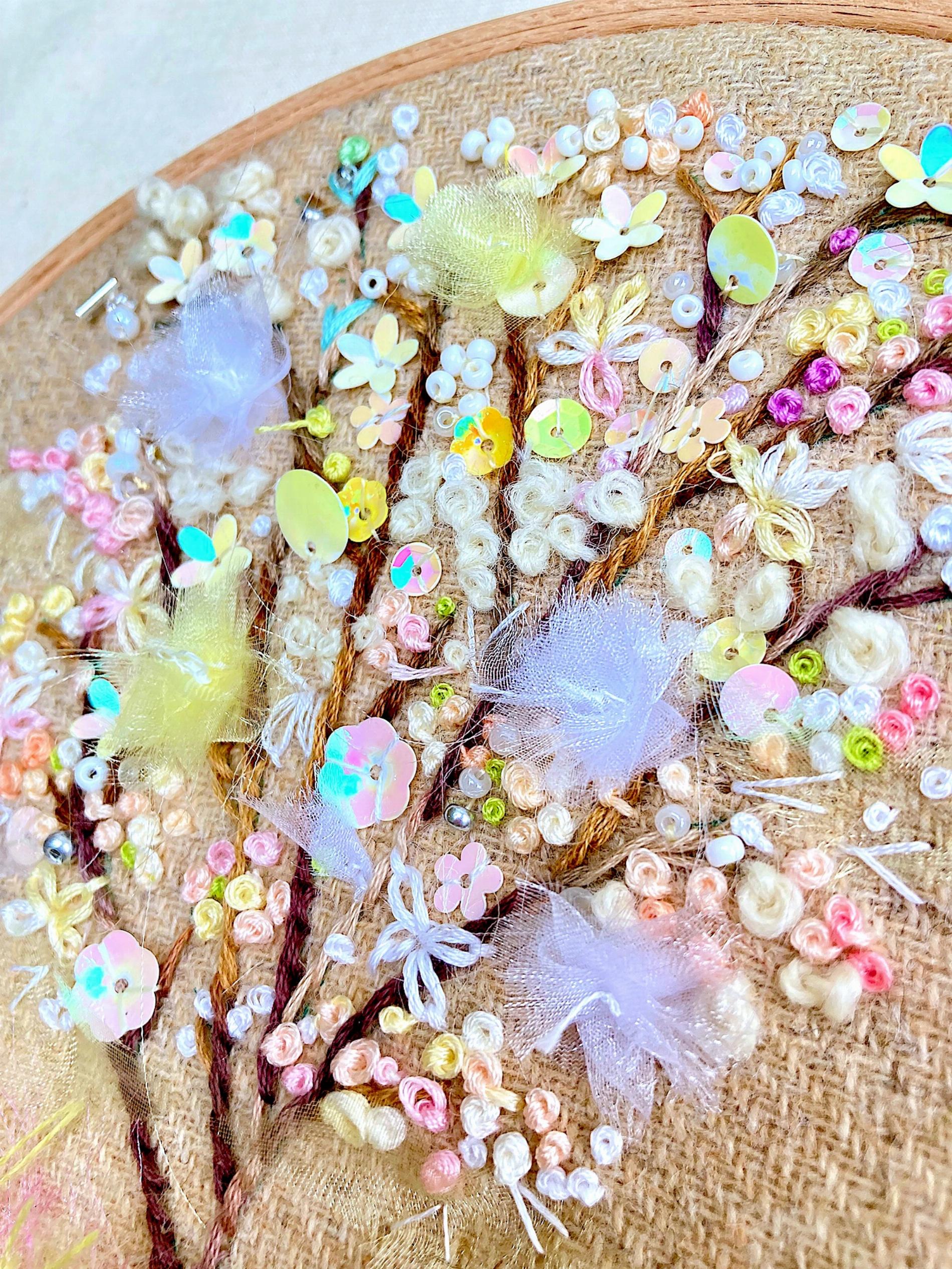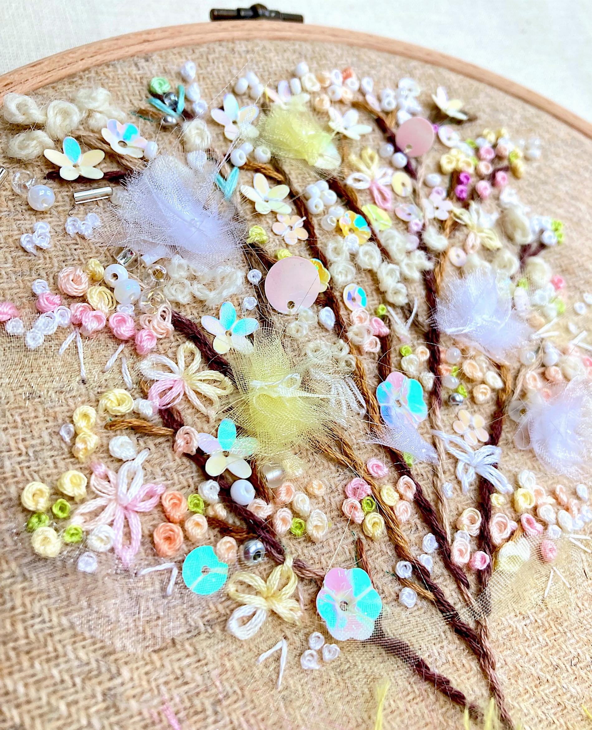 This gorgeous embroidery is stitched on Rowandean’s own unique tweed fabric. Masses of fantastic white blossom literally dripping from the branches of the tree make this kit a visual feast.