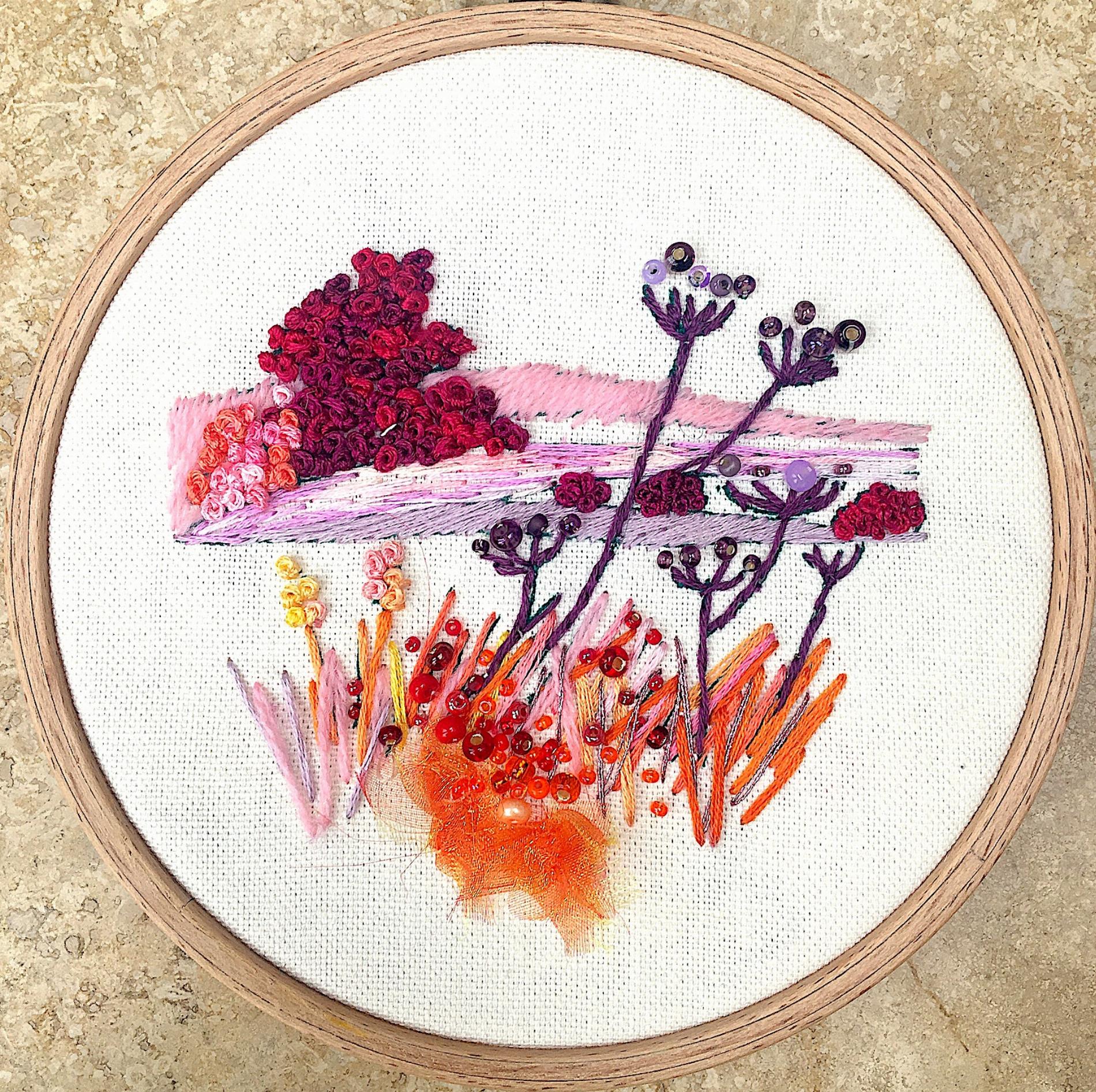 This lovely hand embroidery kit was inspired by the wonderful changing light at different times of day. The kit has a printed background of 100% pure cotton fabric with the majority of the stitching done in simple straight stitches using stranded cotton and wool threads with beads to give a little bling. Mount in our 5” hardwood display hoops for a truly expert looking finish.