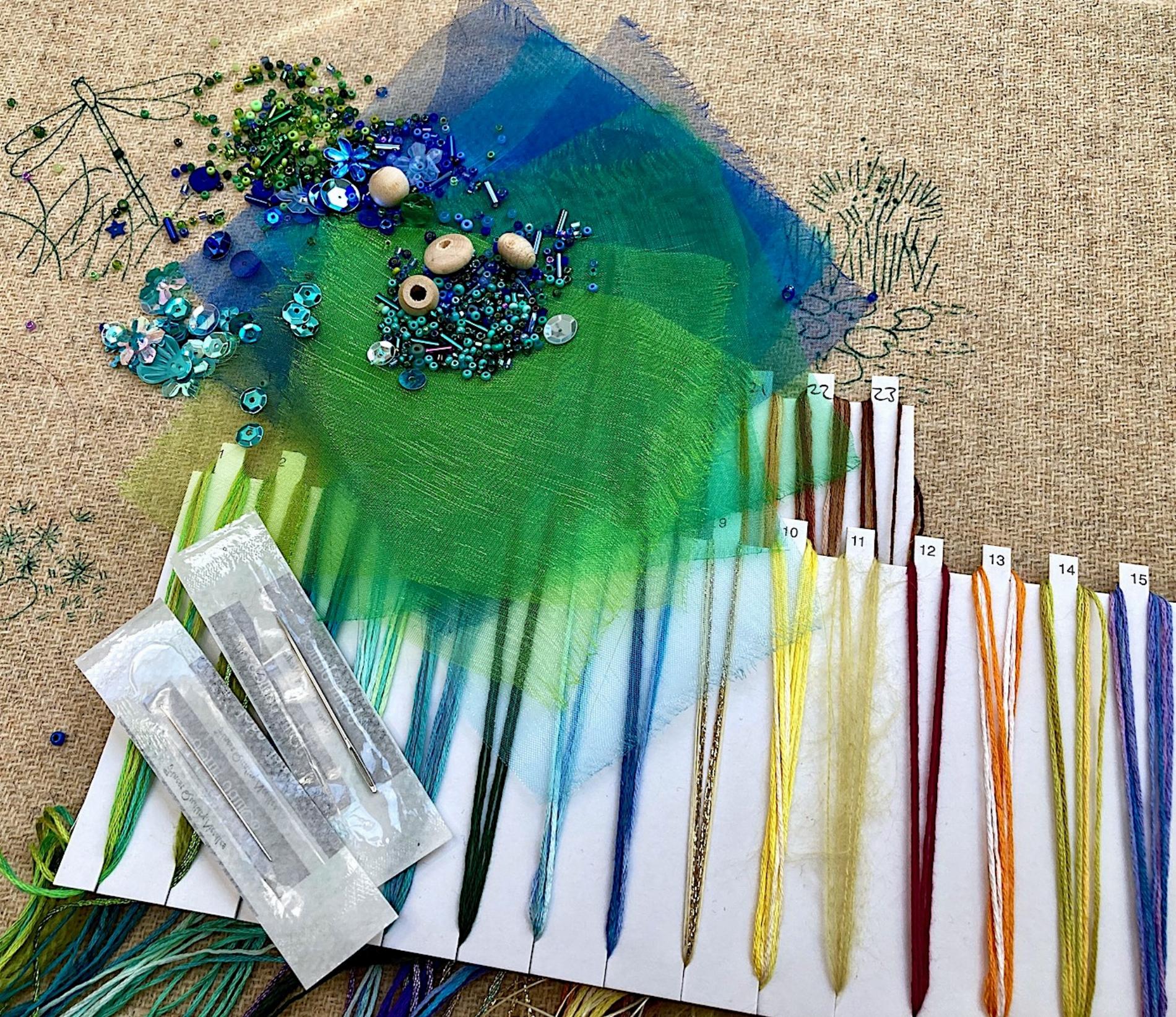 The Beautiful colours of water and it’s movement are recreated for you to stitch and turn into cards. Coloured organza for the backgrounds