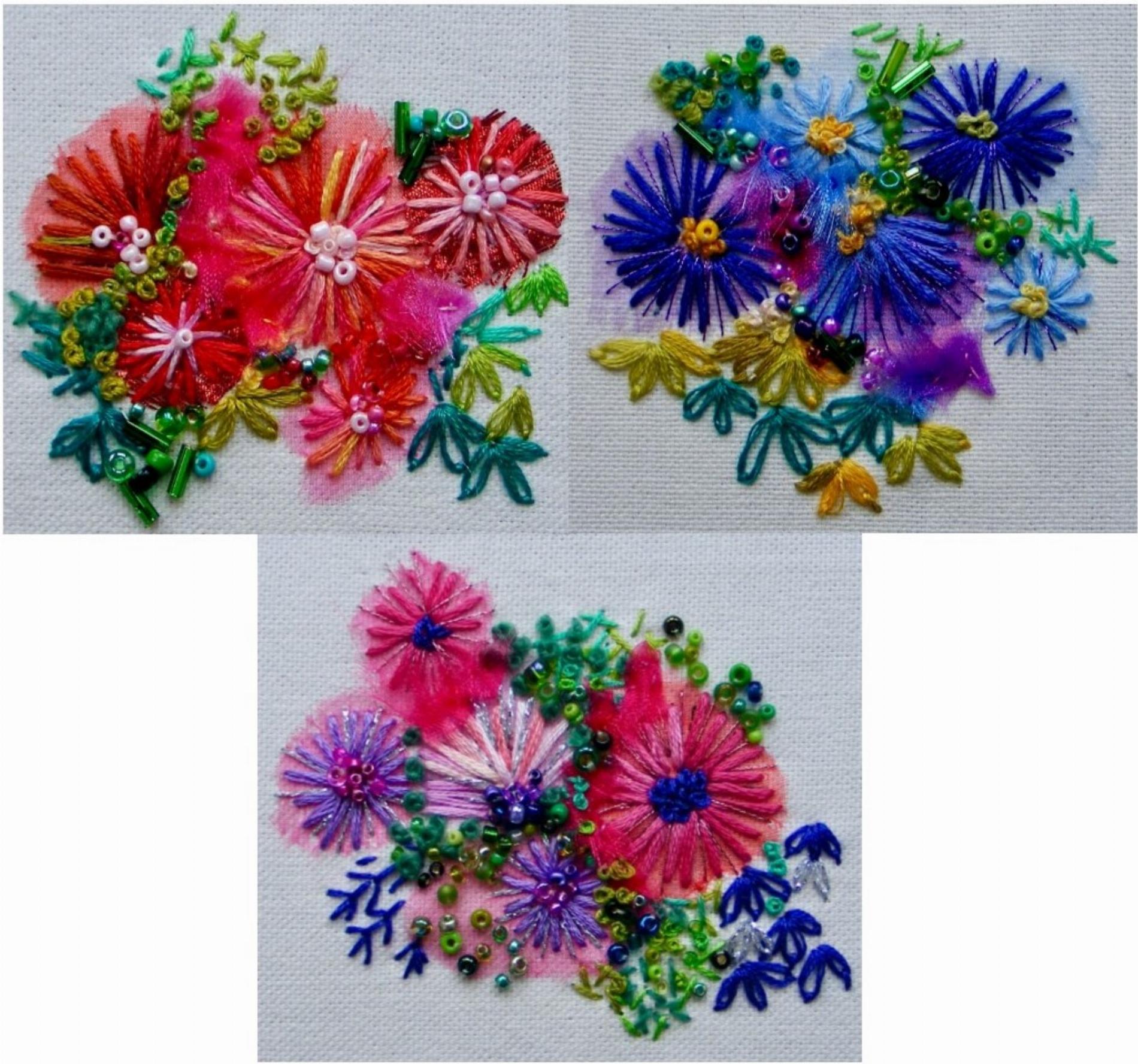 This lovely kit has three separate embroideries of different colour asters. Asters are summer time favourites in any garden and these easy to do designs will brighten up your day. Inside every Rowandean kit you will find fabric with design clearly printed, threads on an organizer card, coloured organza fabrics and beads, clear "customer proof" instructions and diagrams, a chenille needle (bigger eye than an ordinary needle) wrapped in protective plastic, and on the front cover, Rowandean's "see every stitch" colour photo.